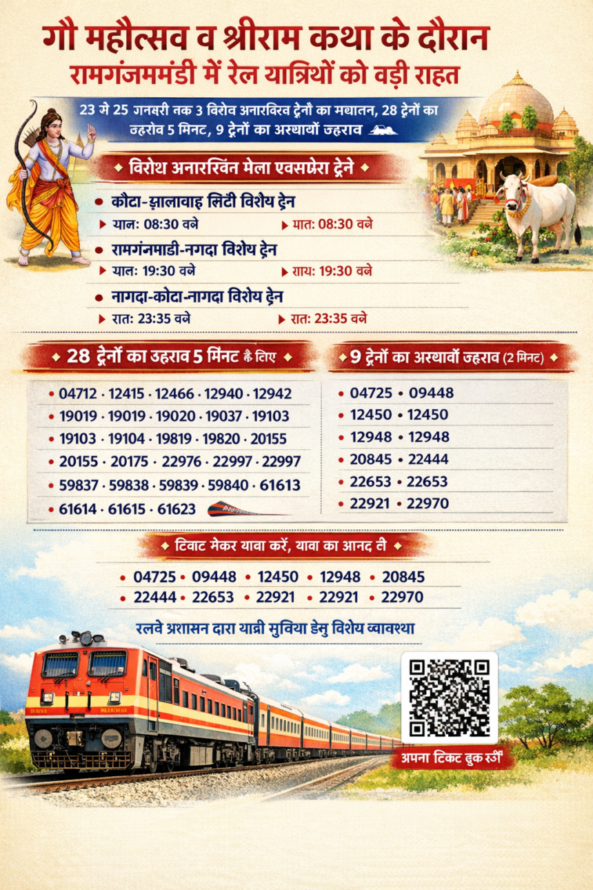 गौ महोत्सव व श्रीराम कथा के दौरान रामगंजमंडी में रेल यात्रियों को बड़ी राहत, 23 से 25 जनवरी तक 3 विशेष अनारक्षित ट्रेनों का संचालन, 28 ट्रेनों का ठहराव 5 मिनट, 9 ट्रेनों को अस्थायी ठहराव