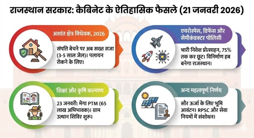 राजस्थान कैबिनेट के बड़े फैसले: ‘अशांत क्षेत्रों’ में संपत्ति सुरक्षा के लिए आएगा विधेयक; सेमीकंडक्टर और डिफेंस पॉलिसी को मंजूरी, जानें बैठक का पूरा निष्कर्ष
