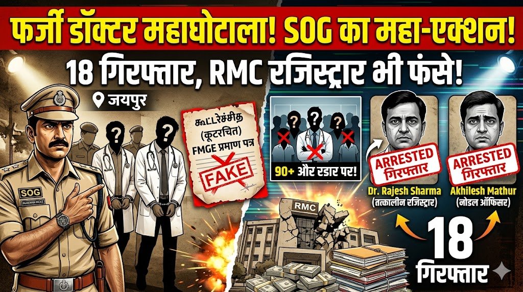 चिकित्सा क्षेत्र में एक बेहद गंभीर और बड़ा फर्जीवाड़ा उजागर करते हुए राजस्थान एसओजी (SOG) ने कूटरचित (फर्जी) एफएमजीई (FMGE) प्रमाण पत्रों के जरिए डॉक्टर बनने वाले संगठित गिरोह का भंडाफोड़ किया है। इस सनसनीखेज कार्रवाई में राजस्थान मेडिकल काउंसिल (RMC) के तत्कालीन रजिस्ट्रार डॉ. राजेश शर्मा और नोडल अधिकारी अखिलेश माथुर समेत कुल 18 आरोपियों को गिरफ्तार किया गया है।