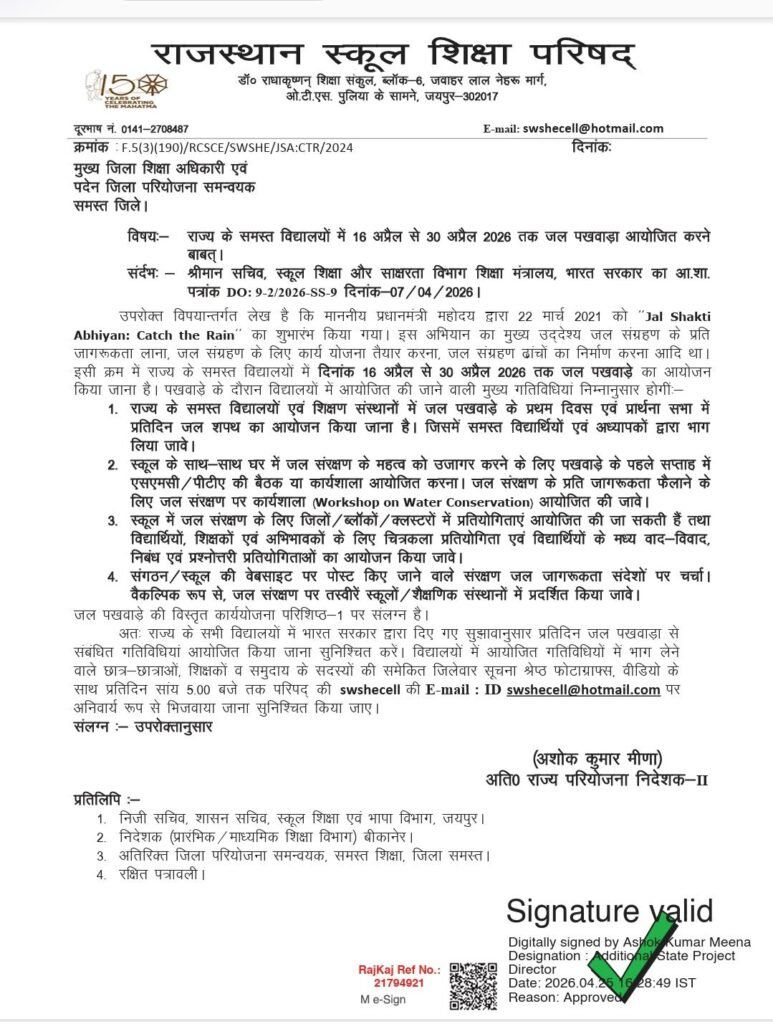 भारत सरकार के ‘जल शक्ति अभियान: कैच द रेन’ के तहत प्रदेश के सभी राजकीय विद्यालयों में 16 अप्रैल से 30 अप्रैल 2026 तक ‘जल पखवाड़ा’ मनाया जाना निर्धारित था। इस दौरान स्कूलों में जल संरक्षण की शपथ, निबंध प्रतियोगिता, पेंटिंग और जागरूकता कार्यशालाएं आयोजित की जानी थीं। नियमानुसार इसके आदेश 16 अप्रैल से पहले जारी हो जाने चाहिए थे, लेकिन राजस्थान स्कूल शिक्षा परिषद के अधिकारियों ने घोर लापरवाही बरतते हुए इसका आदेश 25 अप्रैल को जारी किया।