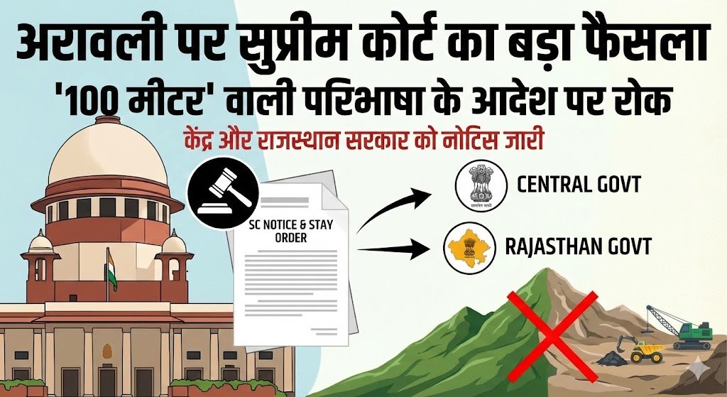 नई दिल्ली/जयपुर। अरावली पर्वत श्रृंखला के संरक्षण को लेकर सुप्रीम कोर्ट ने सोमवार को एक बड़ा और महत्वपूर्ण कदम उठाया है। शीर्ष अदालत ने अपने ही 20 नवंबर के उस आदेश पर रोक (Stay) लगा दी है, जिसमें अरावली की पहाड़ियों के लिए ‘100 मीटर ऊंचाई’ वाली परिभाषा को मंजूरी दी गई थी। कोर्ट ने अब इस मामले में केंद्र सरकार और राजस्थान सरकार सहित चार राज्यों को नोटिस जारी कर जवाब तलब किया है।