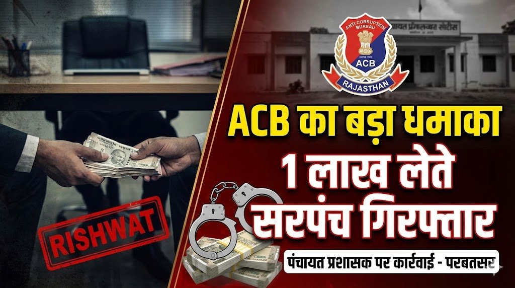 जयपुर– राजस्थान में भ्रष्टाचार के खिलाफ ‘जीरो टॉलरेंस’ की नीति अपनाते हुए भ्रष्टाचार निरोधक ब्यूरो (ACB) ने गुरुवार को एक बड़ी कार्रवाई को अंजाम दिया। एसीबी की जयपुर ग्रामीण टीम ने डीडवाना-कुचामन जिले की ग्राम पंचायत बाजवास के प्रशासक एवं सरपंच राजेंद्र प्रसाद मोयल को 1 लाख रुपये की रिश्वत लेते हुए रंगे हाथों दबोच लिया। यह गिरफ्तारी परबतसर के सांचौर चौराहे पर हुई, जिससे पूरे प्रशासनिक अमले में हड़कंप मच गया।