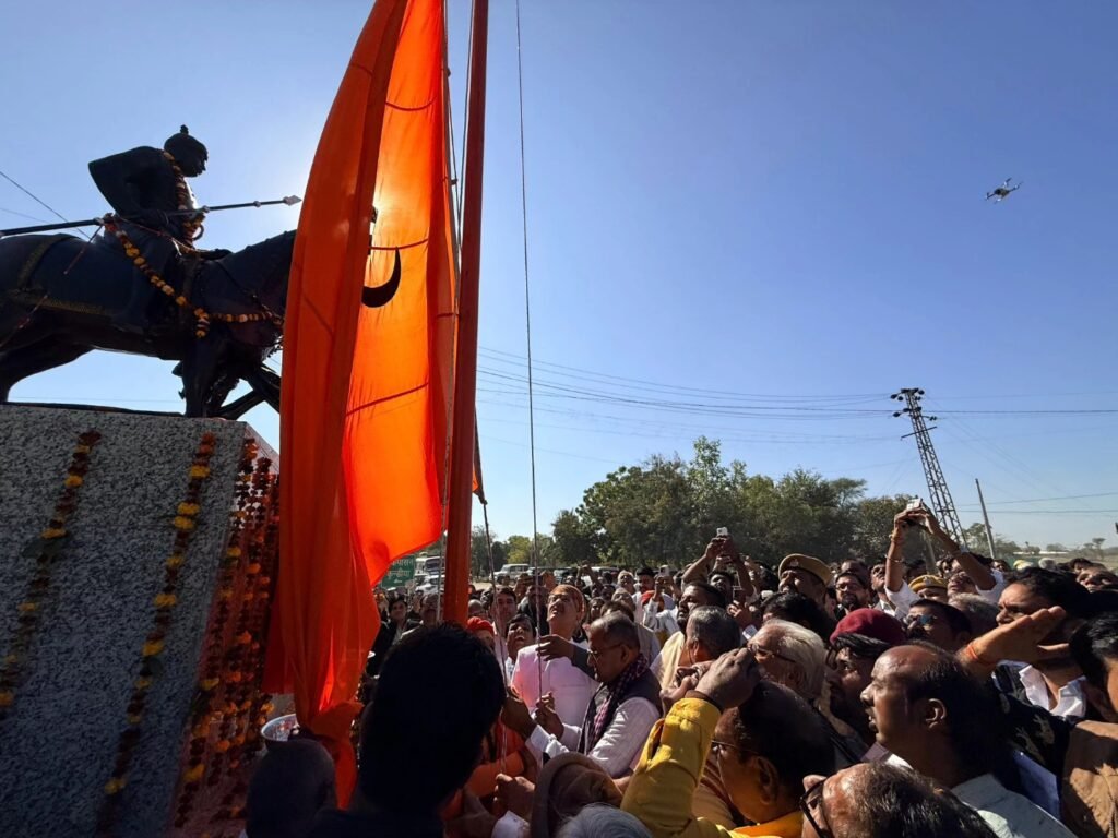 50 फीट ऊंचे भगवा ध्वज और जयकारों से गूंजा आकाश कार्यक्रम का शुभारंभ भारत माता के चित्र के समक्ष दीप प्रज्वलन और राष्ट्रगीत ‘वंदे मातरम’ के साथ हुआ। इसके बाद अतिथियों ने महाराणा प्रताप की मूर्ति का अनावरण किया। साथ ही, पास में ही 50 फीट ऊंचे पोल पर भारतीय संस्कृति के प्रतीक भव्य भगवा ध्वज को स्थापित किया गया।