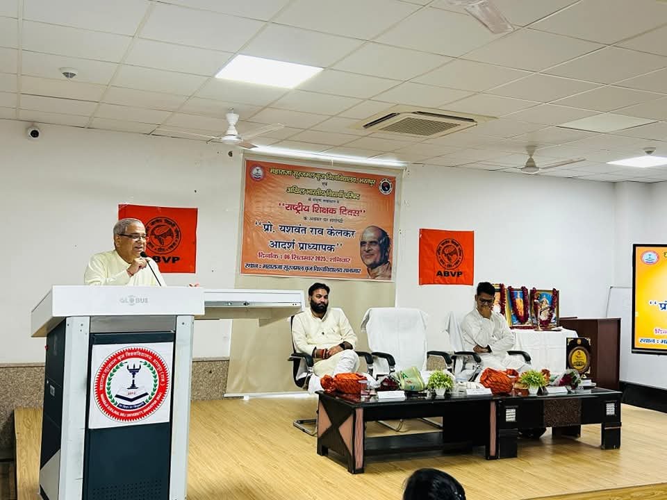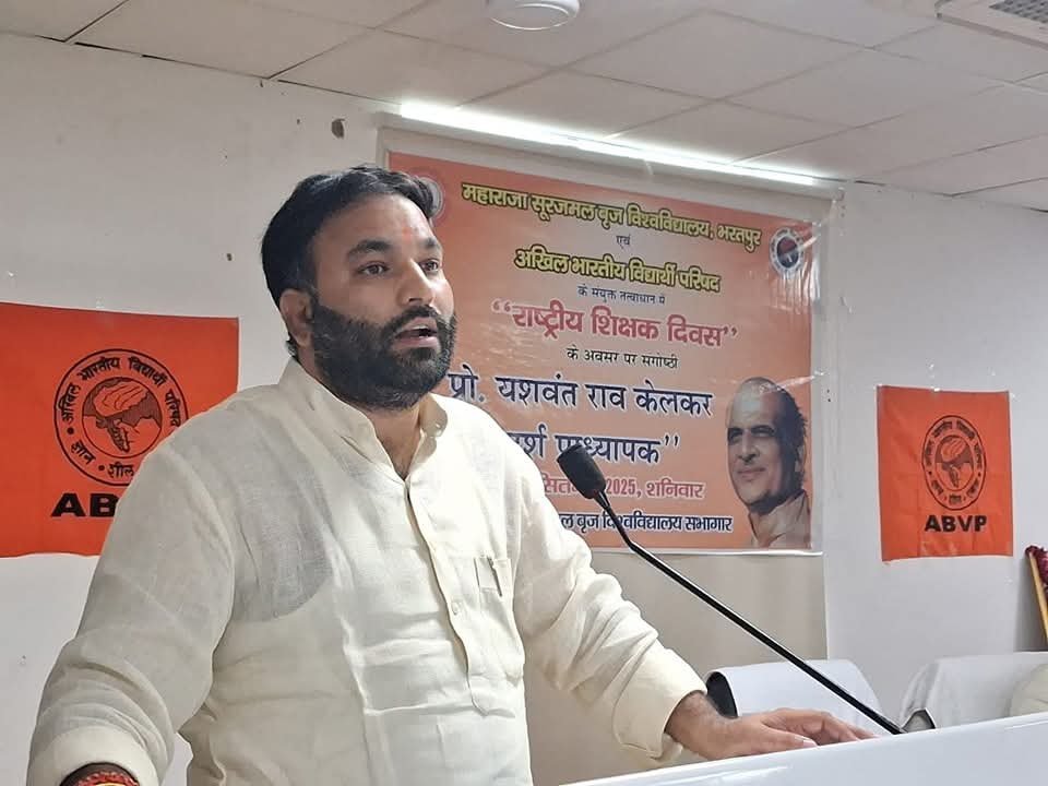 भरतपुर, राजस्थान: राष्ट्रीय शिक्षक दिवस के अवसर पर, महाराजा सूरजमल बृज विश्वविद्यालय और अखिल भारतीय विद्यार्थी परिषद (ABVP) के संयुक्त तत्वावधान में एक महत्वपूर्ण संगोष्ठी का आयोजन किया गया। “प्रो. यशवंतराव केलकर जी – आदर्श प्राध्यापक” विषय पर आयोजित इस संगोष्ठी का उद्देश्य शिक्षकों की गरिमा और राष्ट्र निर्माण में उनकी भूमिका पर प्रकाश डालना था। कार्यक्रम की अध्यक्षता विश्वविद्यालय के कुलगुरु प्रो. त्रिभुवन शर्मा ने की, जबकि अभाविप के प्रांत संगठन मंत्री श्री पूरण सिंह शाहपुरा और राष्ट्रीय स्वयंसेवक संघ (RSS) के भरतपुर विभाग प्रचारक श्री उत्कर्ष विशेष रूप से उपस्थित रहे।