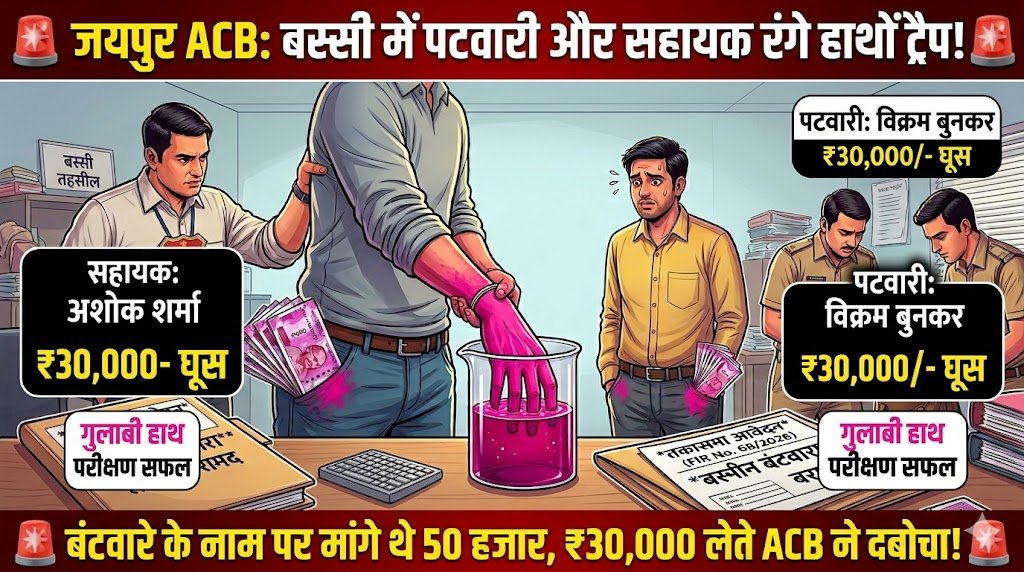 जयपुर/बस्सी । राजस्थान भ्रष्टाचार निरोधक ब्यूरो (ACB) की जयपुर ग्रामीण टीम ने भ्रष्टाचार के खिलाफ एक प्रभावी कार्रवाई करते हुए बस्सी तहसील कार्यालय में तैनात एक पटवारी और उसके निजी सहायक (ग्राम प्रतिहारी) को 30,000 रुपये की रिश्वत लेते हुए रंगे हाथों गिरफ्तार किया है । यह घूस पुश्तैनी जमीन के आपसी सहमति से बंटवारे (तकासमा) की फाइल आगे बढ़ाने की एवज में मांगी गई थी ।