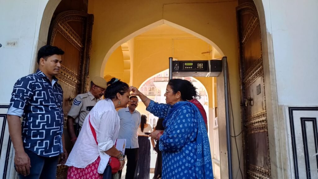 राजस्थान की राजधानी जयपुर में आज ‘विश्व धरोहर दिवस’ के अवसर पर पर्यटकों का बेहद खास और पारंपरिक अंदाज में स्वागत किया गया। गर्मी की तपिश के बावजूद देशी और विदेशी सैलानियों के उत्साह में कोई कमी नहीं दिखी। विश्व प्रसिद्ध हवा महल पर आने वाले हर पर्यटक का हवा महल की अधीक्षक सरोजिनी चंचलानी ने तिलक लगाकर अभिनंदन किया, जिससे अभिभूत होकर विदेशी मेहमानों ने भी राजस्थानी संस्कृति की जमकर प्रशंसा की।