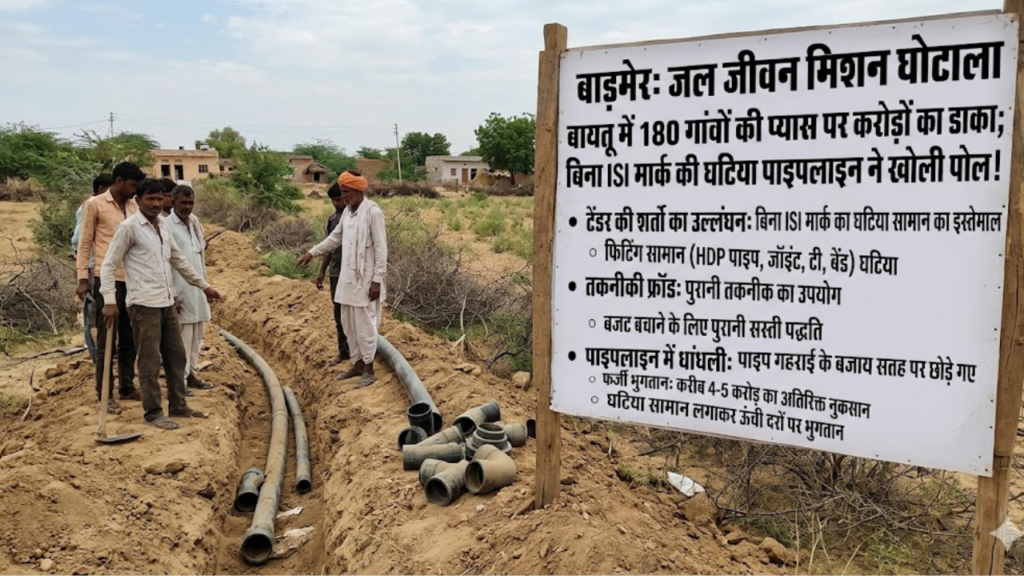 राजस्थान में भ्रष्टाचार की जड़ें कितनी गहरी हैं, इसका एक और सनसनीखेज प्रमाण बाड़मेर के बायतू इलाके से सामने आया है। केंद्र सरकार की महत्वाकांक्षी ‘हर घर जल’ पहुंचाने के दावे वाली ‘जल जीवन मिशन’ (JJM) योजना में अधिकारियों और ठेकेदारों की नापाक मिलीभगत ने सरकार को करोड़ों रुपये का चूना लगा दिया है। यह घोटाला न केवल वित्तीय है, बल्कि 180 गांवों की जनता की सेहत और भविष्य के साथ भी खिलवाड़ है।