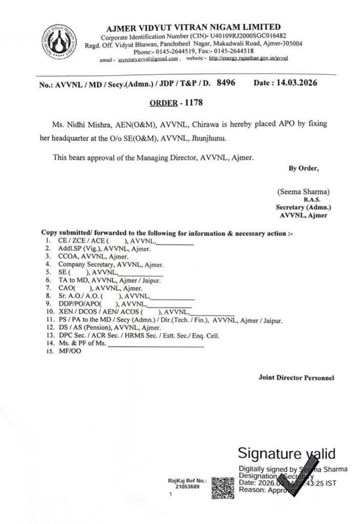 अजमेर विद्युत वितरण निगम लिमिटेड (AVVNL) ने झुंझुनूं के चिड़ावा में तैनात सहायक अभियंता (AEN) निधि मिश्रा के खिलाफ बड़ी प्रशासनिक कार्रवाई की है। निगम की सचिव सीमा शर्मा द्वारा जारी किए गए ताजा आदेश के अनुसार, एईएन निधि मिश्रा को तत्काल प्रभाव से ‘अवेटिंग पोस्टिंग ऑर्डर’ (APO) कर दिया गया है। शनिवार को सरकारी अवकाश होने के बावजूद इस आदेश का जारी होना चर्चा का विषय बना हुआ है। एपीओ किए जाने के बाद अब उनका मुख्यालय झुंझुनूं स्थित अधीक्षण अभियंता (SE) कार्यालय तय किया गया है।