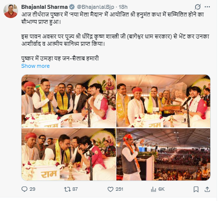 कथा का श्रवण करते हुए सीएम शर्मा ने बागेश्वर धाम के पीठाधीश्वर का अभिनंदन किया। उन्होंने कहा कि पुष्कर जैसे पवित्र स्थान पर ऐसे आध्यात्मिक आयोजन सनातन संस्कृति की ज्योति को प्रज्ज्वलित कर रहे हैं। विशेष रूप से युवाओं के मन में भारतीय संस्कृति और आध्यात्मिक मूल्यों की गहरी समझ विकसित करने में इन आयोजनों की अहम भूमिका है, जिससे समाज में राष्ट्रभावना और नैतिक मूल्यों का सुदृढ़ीकरण होता है।