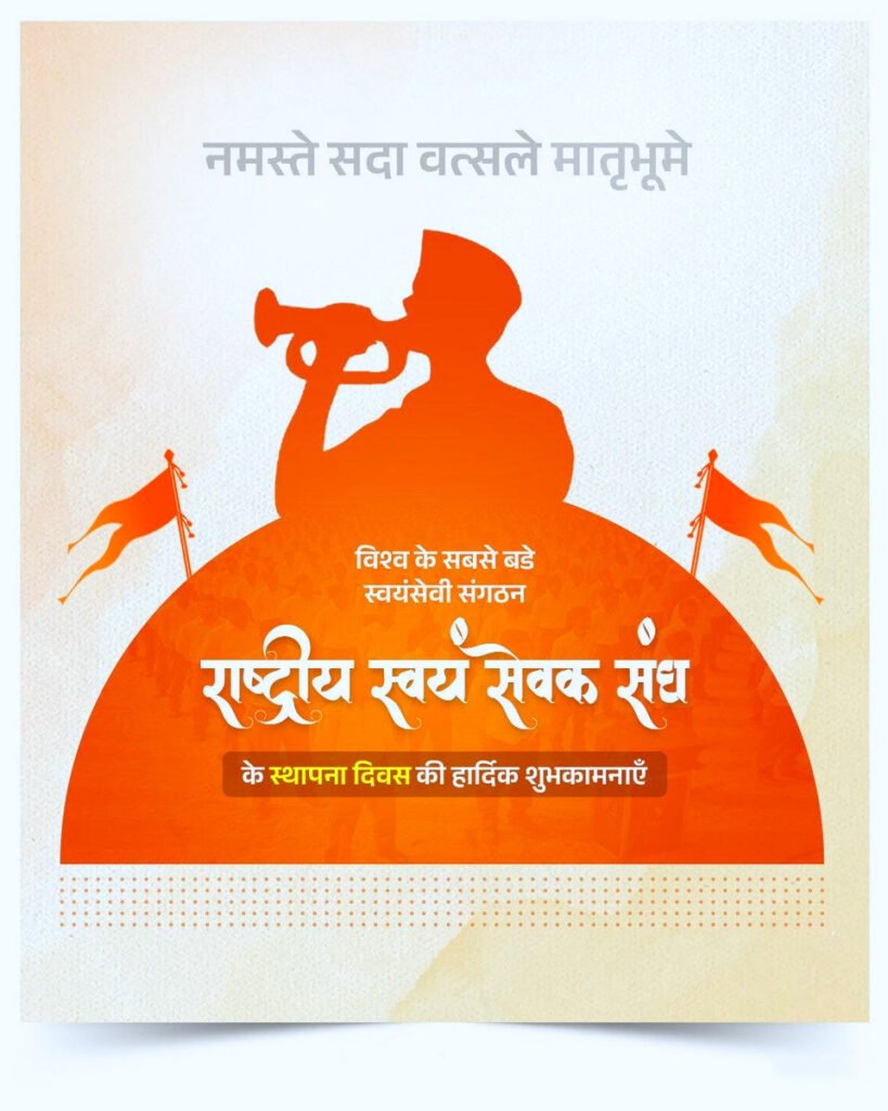 Rashtriya Swayamsevak sangh Foundation Day Wishes Poster Image Banner in Hindi: राष्ट्रीय स्वयंसेवक संघ (RSS) के स्थापना दिवस के अवसर पर पूरे देश में उत्साह का माहौल है। यह पावन पर्व विजयादशमी (Vijayadashami) के दिन मनाया जाता है, जो संघ के 100वें स्थापना वर्ष (Centenary Year) को और भी खास बनाता है।